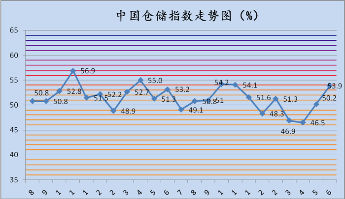 中国物流与采购联合会与中储发展股份有限公司联合调查的中国仓储指数,2022年6月份为53.9%,较上月上升3.7个百分点,继续保持在荣枯线以上。各分项指数中,收费价格指数、期末库存指数及业务活动预期指数较上月有所回落,其余指数均有不同程度的回升。