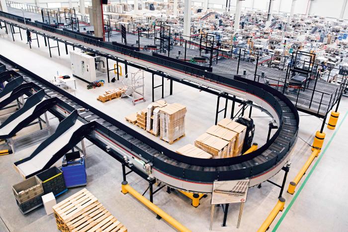 高速分拣机的运动速度为每秒钟1.9m,每小时可以分拣11 150个包裹。尺寸规格在150 mm×80mm×5mm至600mm×600mm×500mm,重量在0.1~35kg的包裹、塑料编织袋和纸质袋都可以在高速分拣机中运送。分拣系统有五个全自动的卸入格口和五条各有28个包装工位的包装线。另外还有六个适用于不同邮递、快递和包裹服务(KEP)的专用包裹输出终端和一个非正常包裹(NiO)处理终端。
