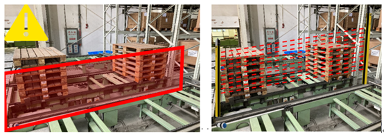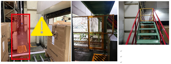 在案例中可以看到该立库系统设有No.1-No.6共6组货架以及1号~3号共3台堆垛机,操作人员从输送机左右两侧进入堆垛机区域,或是跨越相邻巷道时,都将存在机械风险,经过现场的风险评估,劳易测给客户推荐了相应的安全整改方案,有效消除安全隐患,为安全生产提供可靠的防护措施