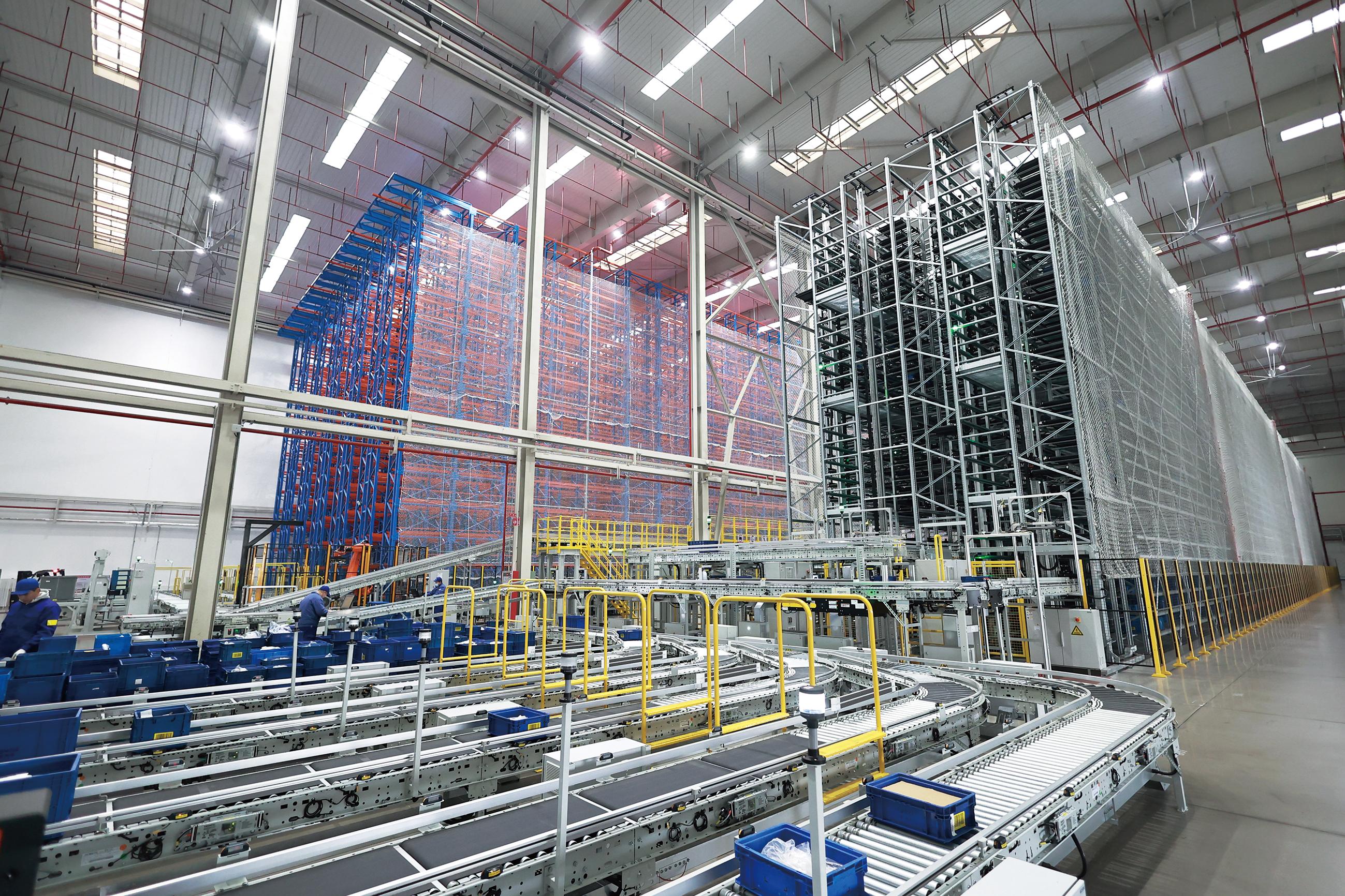 根据不同产线海量定制化需求,仓库零部件规格尺寸多样,且大小件掺杂等特殊情况,德马泰克制定了可兼容大小件的高密度存储策略:大件货品存储于20.5 m高、10 920个货位的托盘堆垛机系统,小件货品存储在巷道长达100 m、33 600个货位的多层穿梭车系统,两套系统不仅空间利用率高,还可根据需求灵活扩展,满足年产35万台发动机的零配件存储需求。