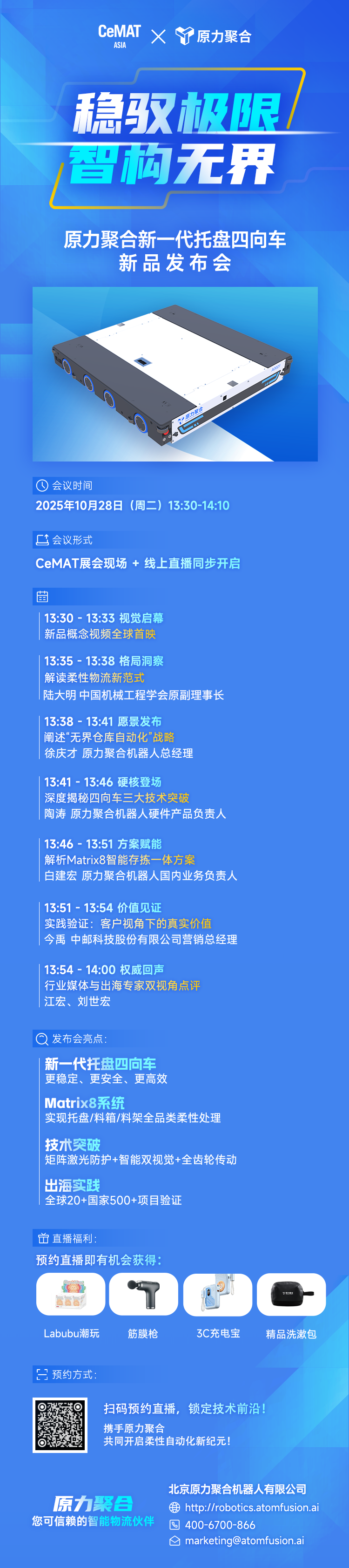 10月28日,原力聚合将以"稳驭极限,智构无界"为主题,在CeMAT ASIA展会期间重磅发布新一代托盘四向车。