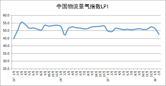 中国物流与采购联合会发布的2026年2月份中国物流业景气指数为47.5%,较上月回落3.7个百分点。
